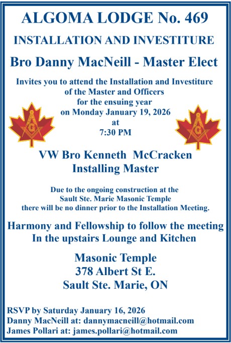 Due to the ongoing construction at the Sault Ste. Marie Masonic Temple, there will be no dinner prior to the Installation Meeting.