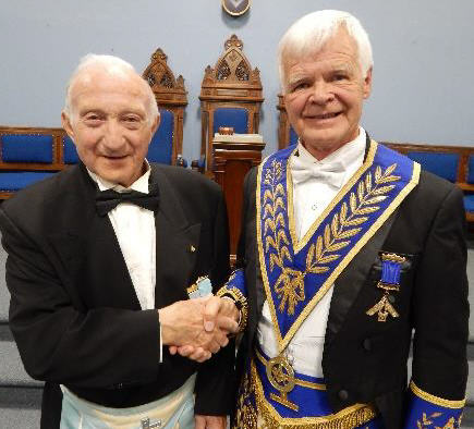 At the Official Visit to Hatherly Lodge No. 625 on October 11, 2018 R. W. Bro. George Thomas the DDGM for Algoma East District presented W. Bro. Frank Smith with his 50 Year Pin and Jewel.