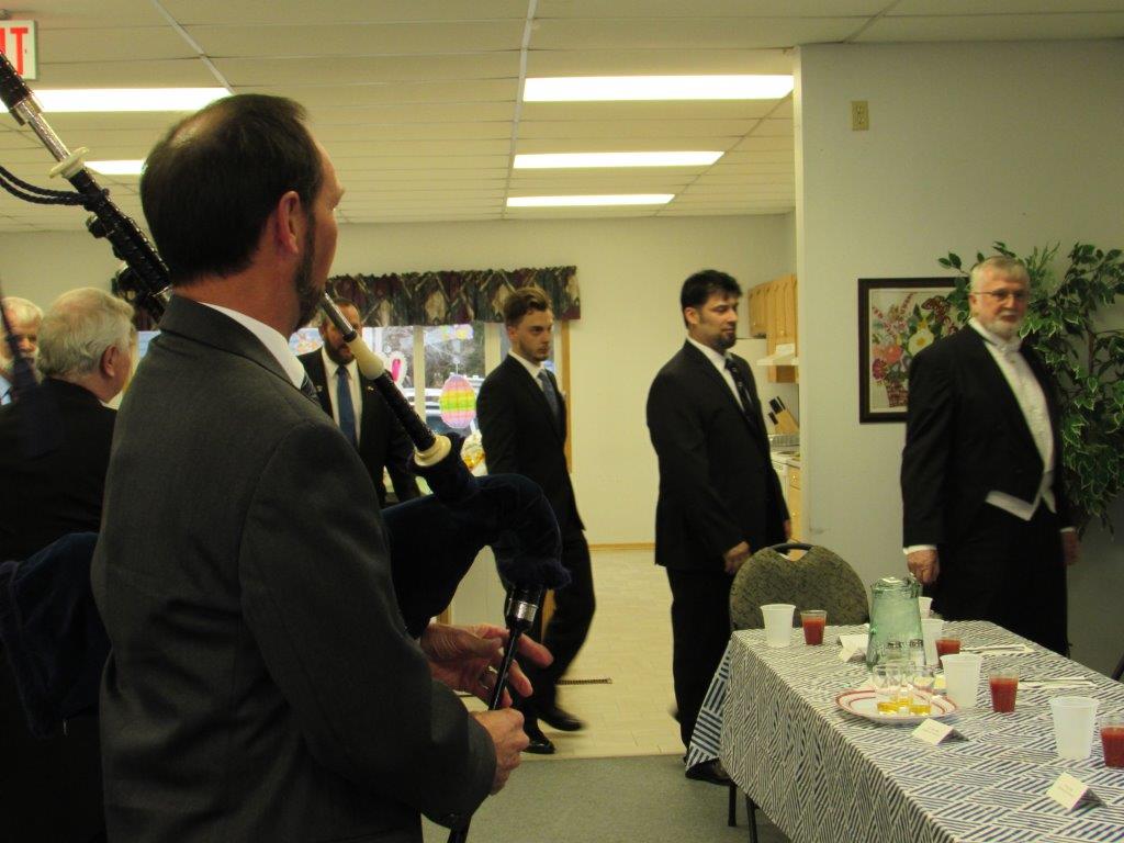 Piper W. Bro Clifford Graham pipes in the Head Table at R.W. Bro. Rodney Norman Caughill’s Official Visit to Penewobikong Lodge April 10, 2017.