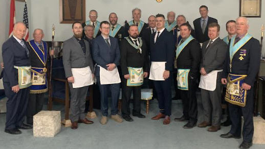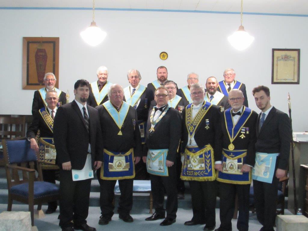 Front Row Left to Right: W. Bro. Don Mitchell, V. W. Bro. Norm Pemberton, Bro. James Poyton, Bro. Jordan Jensen, W. Bro. Rusty Joncas, Bro. Chris Zagar (Candidate), Bro. Dan Middaugh, Bro. Nickolas Viel, R. W. Bro. Brian Olson