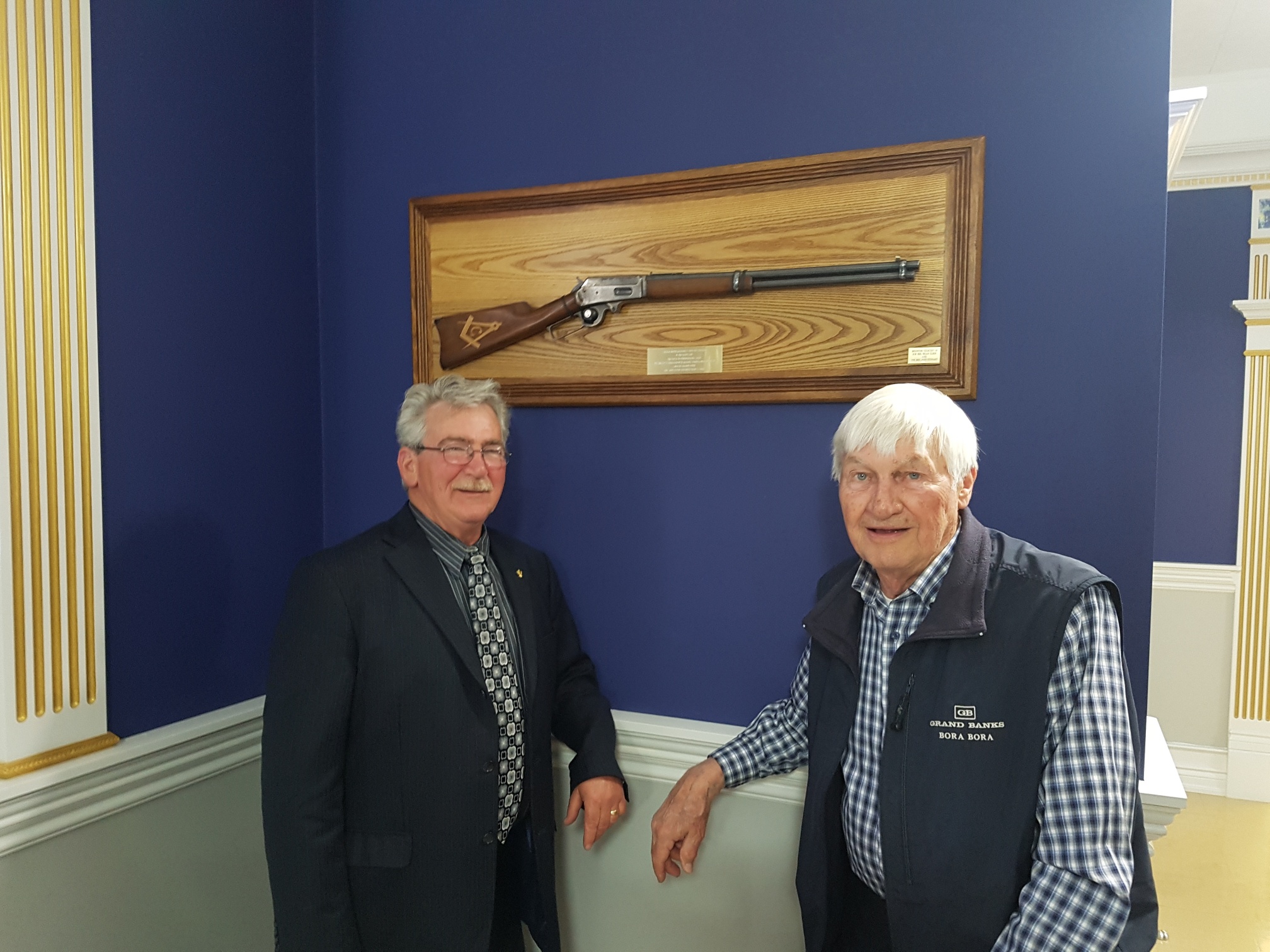 W. Bro. Scott Sine on the left stands with Mr. Lincoln North who donated his Grandfather’s (he was a Mason) 30.30 rifle to Penewobikong Lodge.