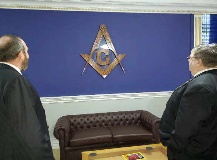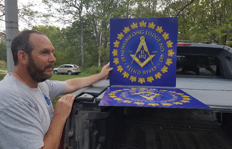 W. Bro. Mark Daub and Bro. Steve Brisbois peruse a newly erected Square & Compass crafted and presented to Penewobikong Lodge No 487 by R.W. Bro. Brian Olson