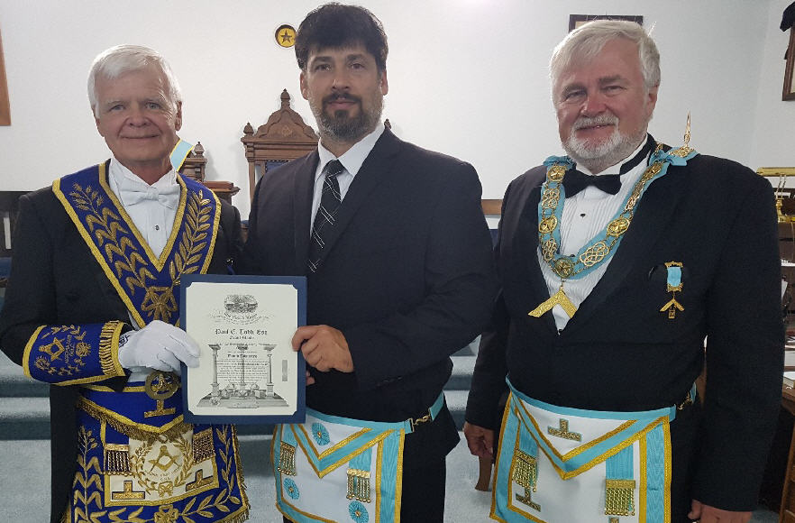 Bro. David Posteraro (Centre)receives his Master Masons Certificate from R. W. Bro. George E. Thomas DDGM of Algoma East District (L) and W. Master W. Bro. Art Friesen (R).