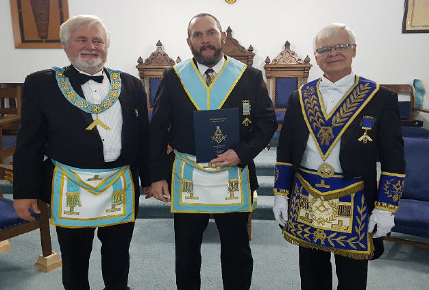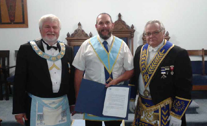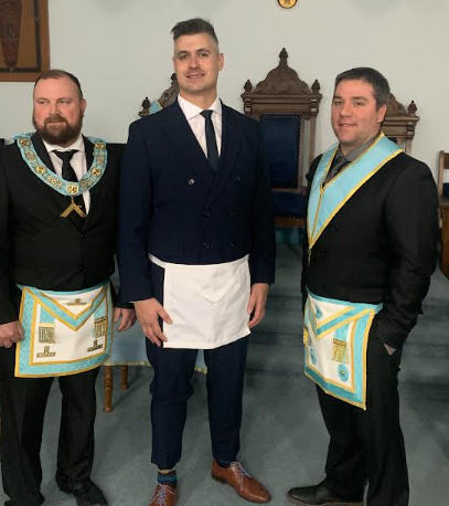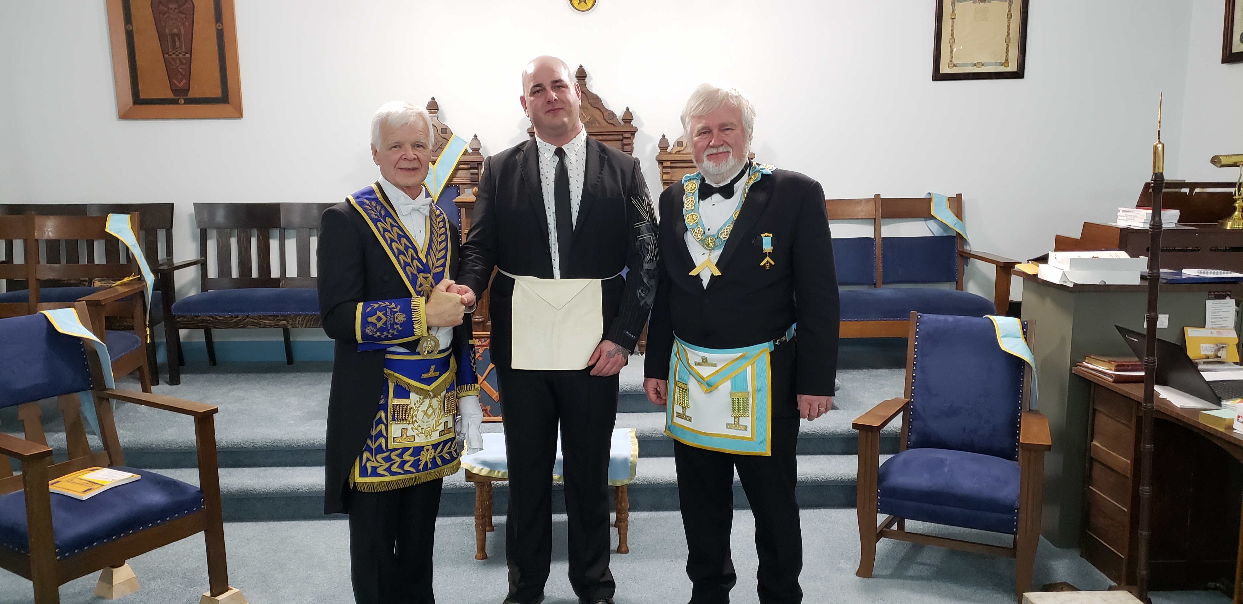 Left – Right: Bro. David Posteraro (Sponsor), Bro. Brad Alger (Candidate) and R.W. Bro. Paul Astles (Sponsor).