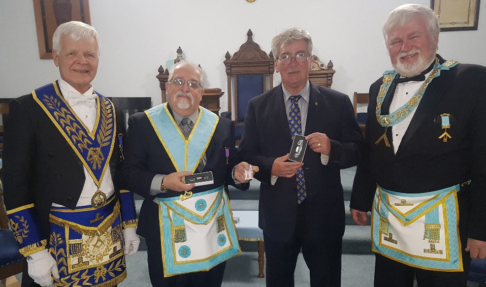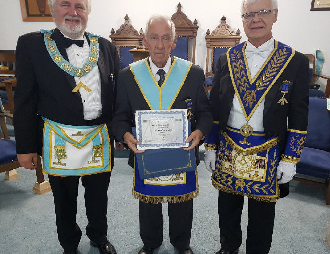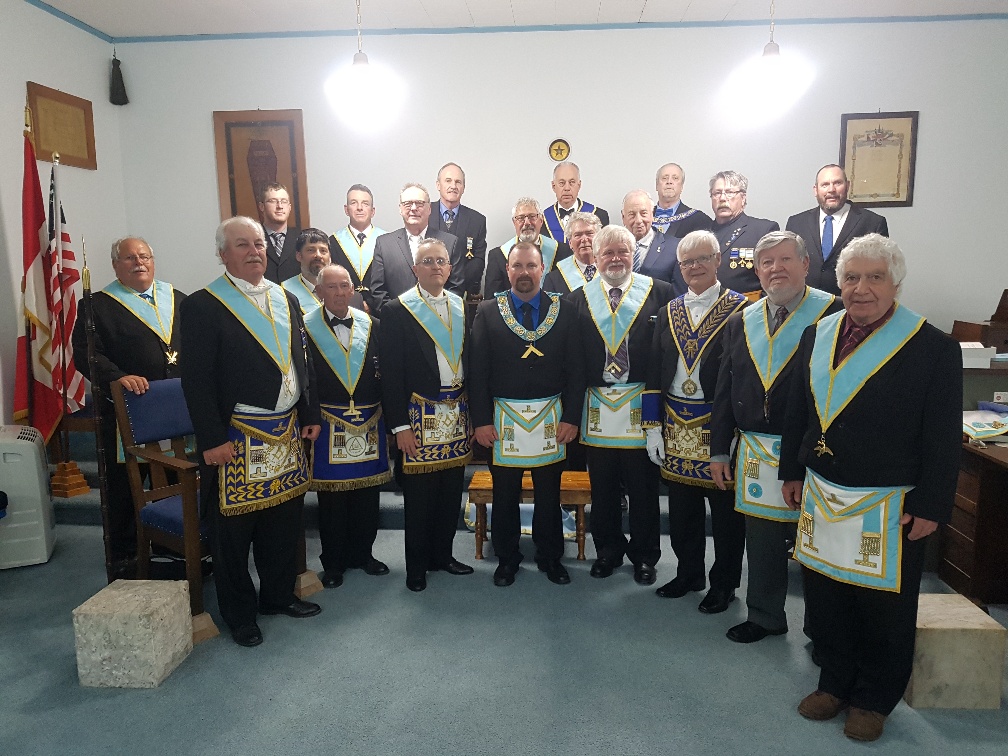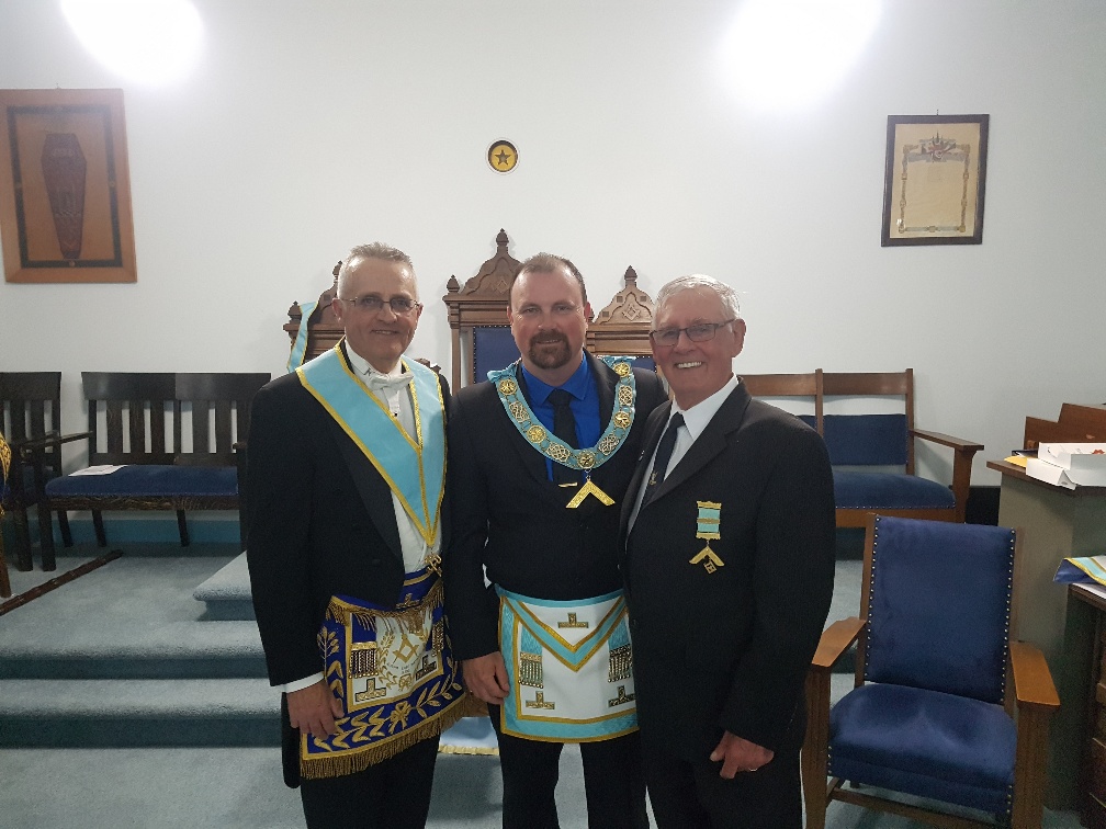 Left – Right: R.W. Bro. Paul Astles (Sponsor), W. Bro. Rusty Joncas New Worshipful Master for 2019 – 2020 and W. Bro. Bob Rae (Sponsor).