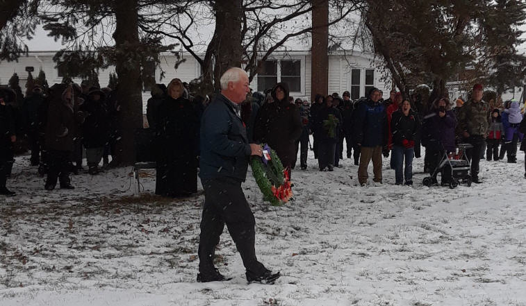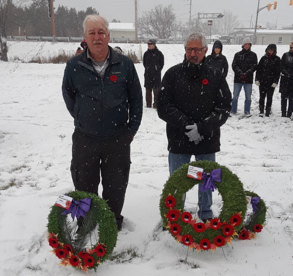 R.W. Bro. Brian Olson and R.W. Bro. Alex Solomon stand ready to present wreaths at the Remembrance Day Ceremony 2018.