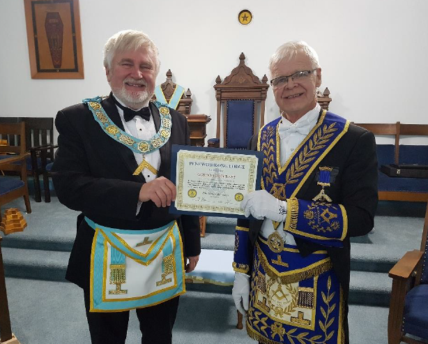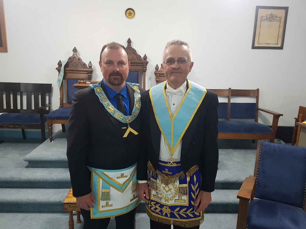 New Worshipful Master for 2019 – 2020 W. Bro. Rusty Joncas and R.W. Bro. Paul Astles (Installing Master)