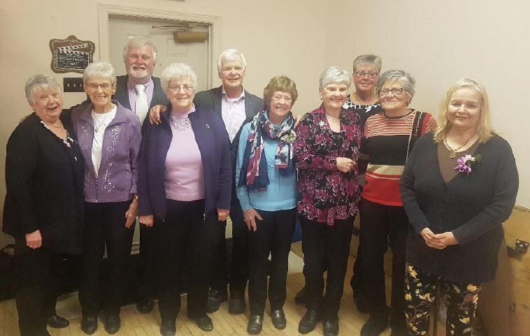 (L – R) Evelyn Daub, Anne Astles, W. Master Art Friesen, Shelia Fullerton, R.W. Bro. George Thomas DDGM of Algoma East District, Joyce Miller, Barb Lees, Sue Ashdown, Gail Brisbois and Beth Woods.