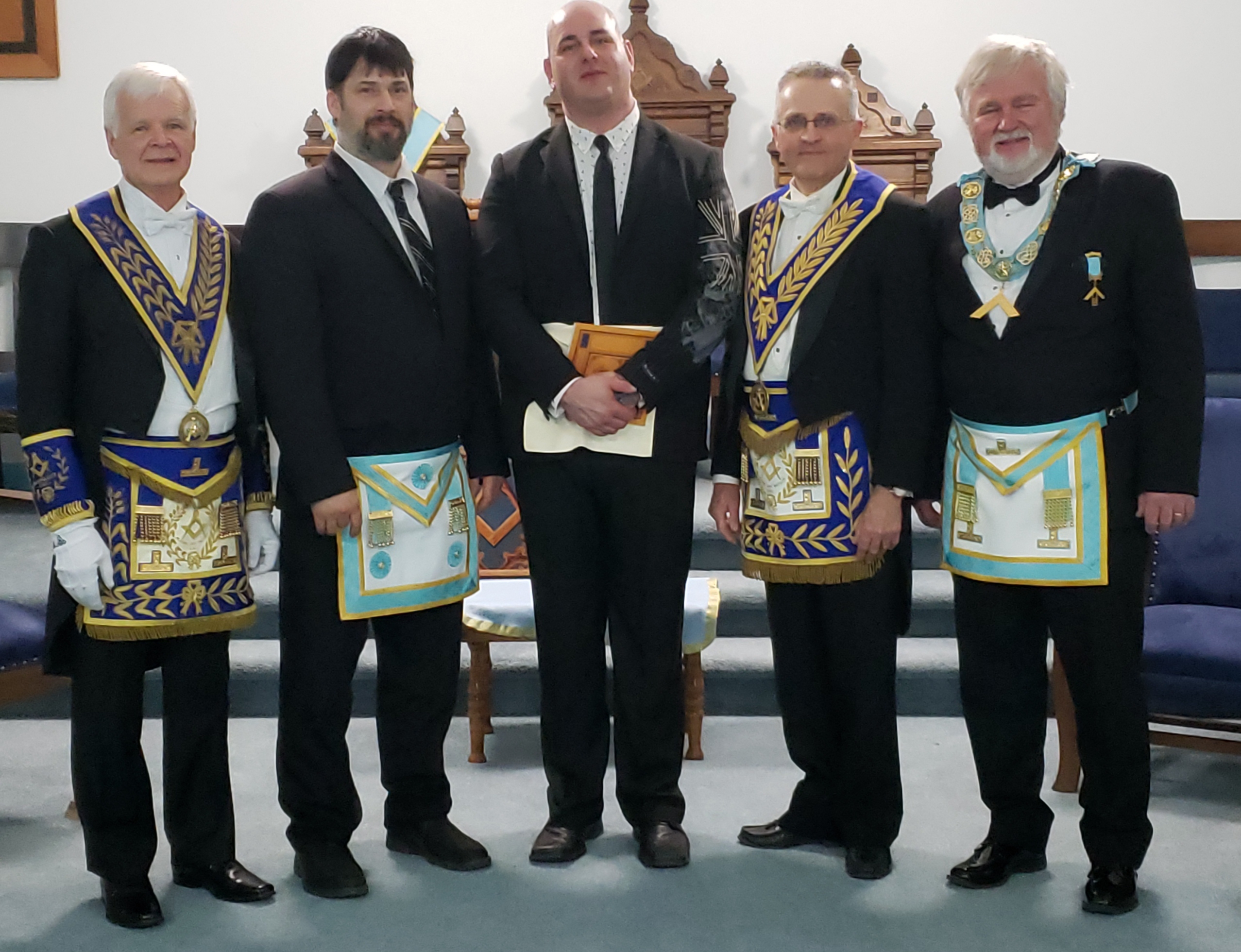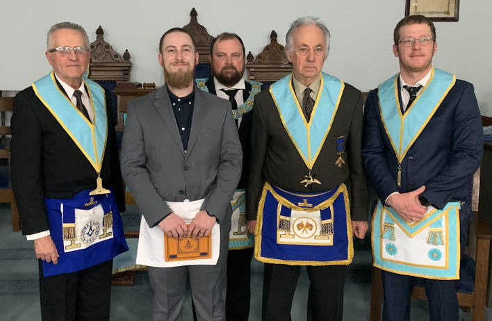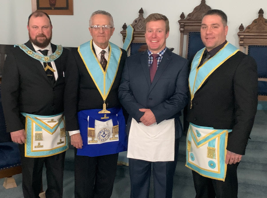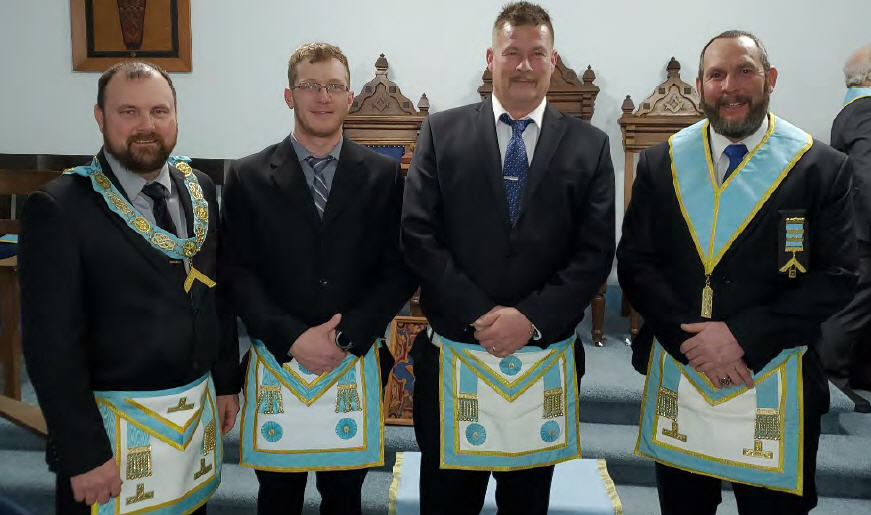 Left to Right: W. Bro. Rusty Joncas (Worshipful Master of Penewobikong Lodge 487), R.W. Bro. Paul Astles, Bro. Nickolas Viel (Candidate) and Bro. Dan Middaugh.