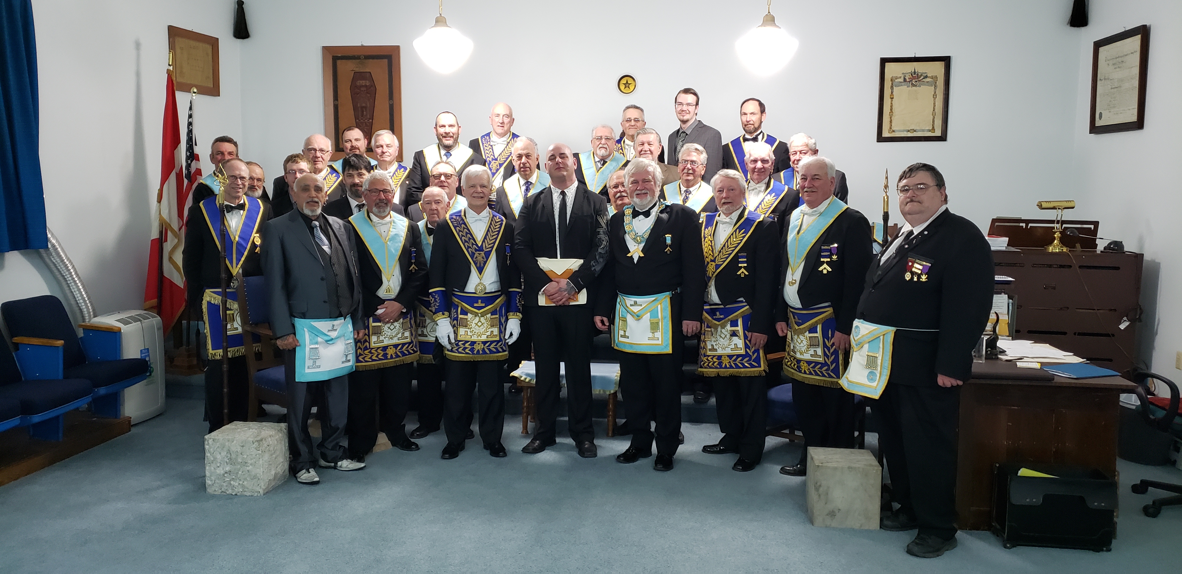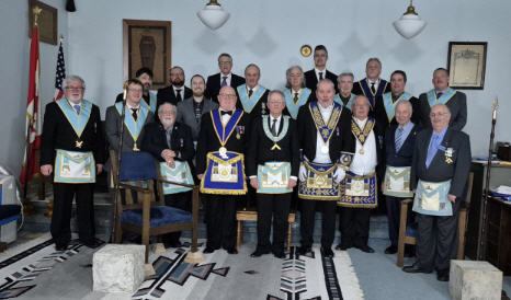 (Front Row L to R) R. W. Bro. Alex Solomon, V. W. Bro. Norm Pemberton, W. Bro. Mark Daub, W. Master Art Friesen, R. W. Bro. Harry Thomas DDGM of Algoma East District and R. W. Bro. Brian Olson