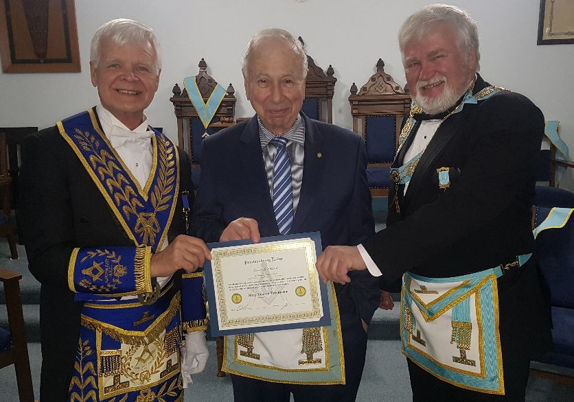 Worshipful Master W. Bro. Bernhard Wiesner , V.W. Bro. John Stewart receives his 25 year pin and certificate & DDGM R.W. Bro. J. Henry Lewis.