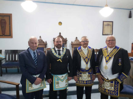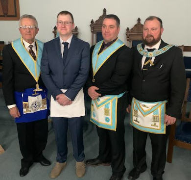 Left to Right: R.W. Bro. Paul Astles, Bro. James Poyton (Candidate), W. Bro. Rusty Joncas (Worshipful Master of Penewobikong Lodge), V. W. Bro. Armand Pitre and Bro. Brad Landry.