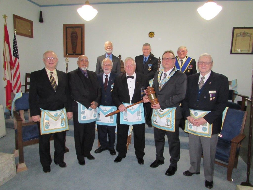 Front Row L-R Bro. Bill Baker, Bro. Mickey Campbell (SW), W. Bro. Ian McKay (PM), Worshipful Master of Elliot Lake Lodge No. 698 R.W. Bro. Norm Mathie, Worshipful Master of Penewobikong Lodge No. 487 W. Bro. Bernhard Wiesner and Bro. Bob Prout.
